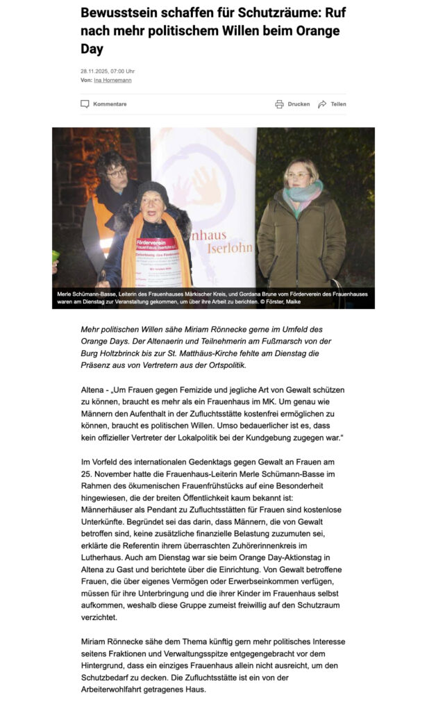 Am Orange Day am 25.11.2025 veranstalteten verschiedene Gruppen einen Fußmarsch von der Burg Holtzbrink bis zur St.Matthäus-Kirche in Altena, um auf das Thema Gewalt gegen Frauen aufmerksam zu machen. Der Marsch endete im Außengelände der Kirche, wo die Teilnehmer sich bei Feuerschein und Musik durch den Posaunenchor, bei Heißgetränken aufwärmen konnten.