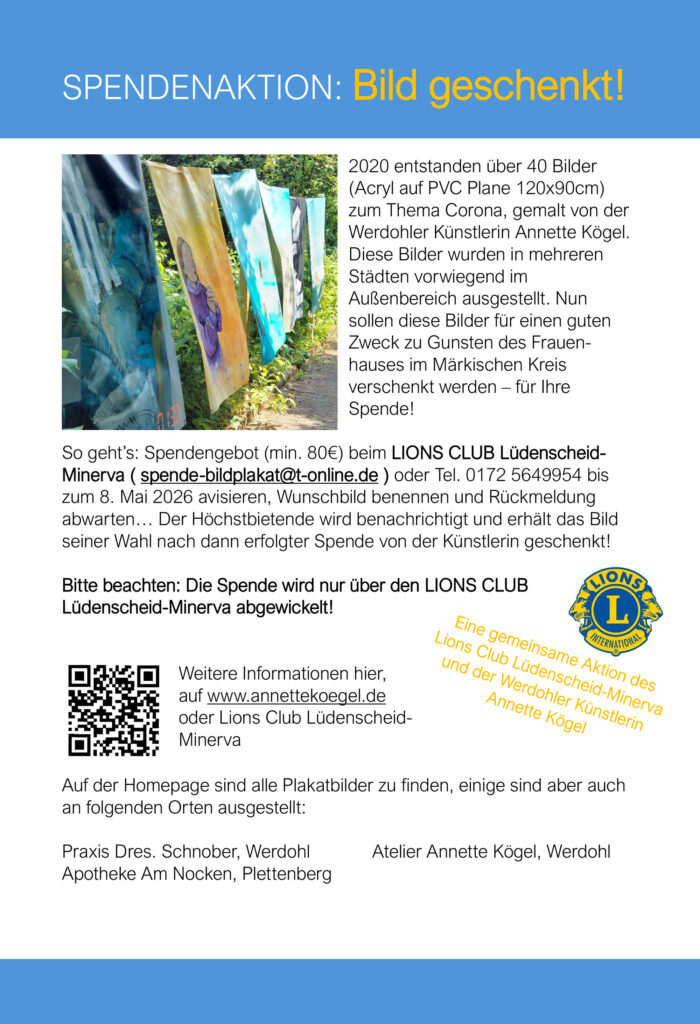Der Lions Club Lüdenscheid Minerva verschenkt Bilder gegen Spende zugunsten des Fördervereins Frauenhaus Iserlohn e.V.: Über 40 Werke der Werdohler Künstlerin Annette Kögel aus der Corona-Zeit werden dafür abgegeben. Interessierte können bis zum 8. Mai 2026 ein Mindestgebot ab 80 Euro einreichen; die Höchstbietenden erhalten ihr Wunschbild.